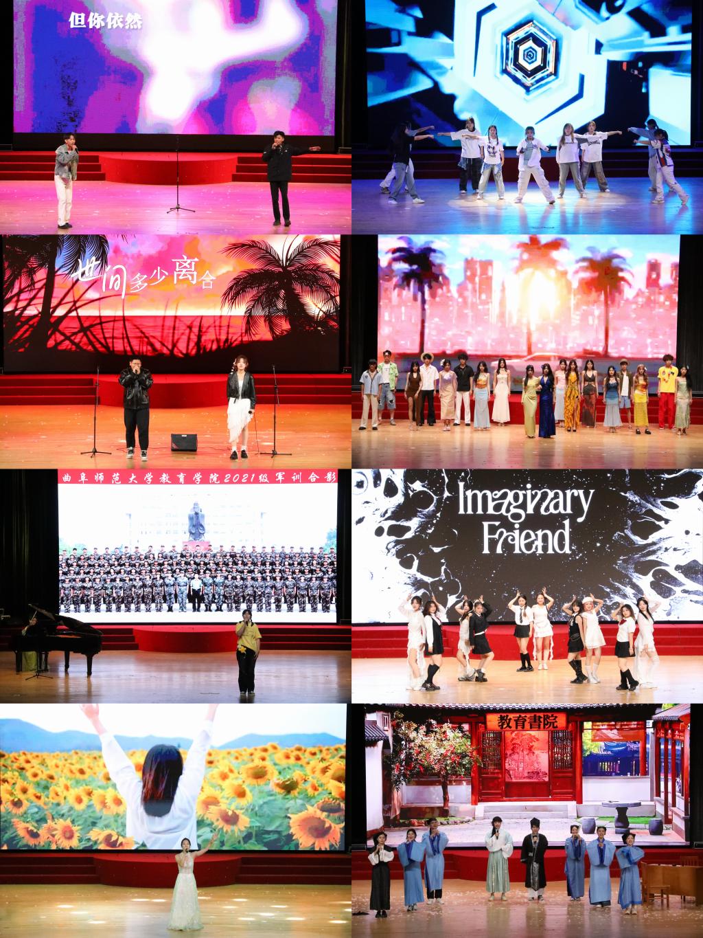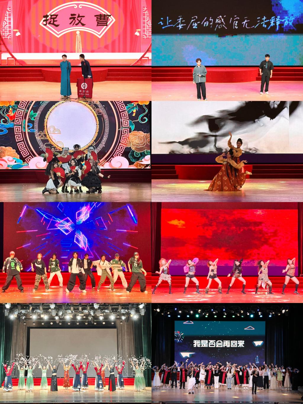 晚会在开场舞《Universe》中拉开帷幕,活力四射的舞蹈点燃全场;歌曲《追风的飞鸟》《像风一样》传递自由韵律,舞蹈《幻想朋友》《舞韵流光》等节目用灵动舞姿演绎青春活力,嗨翻现场;相声《捉放曹》、小品《教育书院》以幽默包袱逗笑观众,精彩不断。走秀《海域情书》展现独特魅力,说唱《别怕变老》用节奏诉说态度,舞蹈《寄明月》《Toxic》等节目持续释放青春活力。歌曲《下一个天亮》《老男孩》唤起青春共鸣,最后由全体演职人员共同合唱《再见》,于旋律中凝聚不舍与祝福。全体演职人员在整场演出中,用多样节目编织回忆,书写属于青春的精彩篇章。