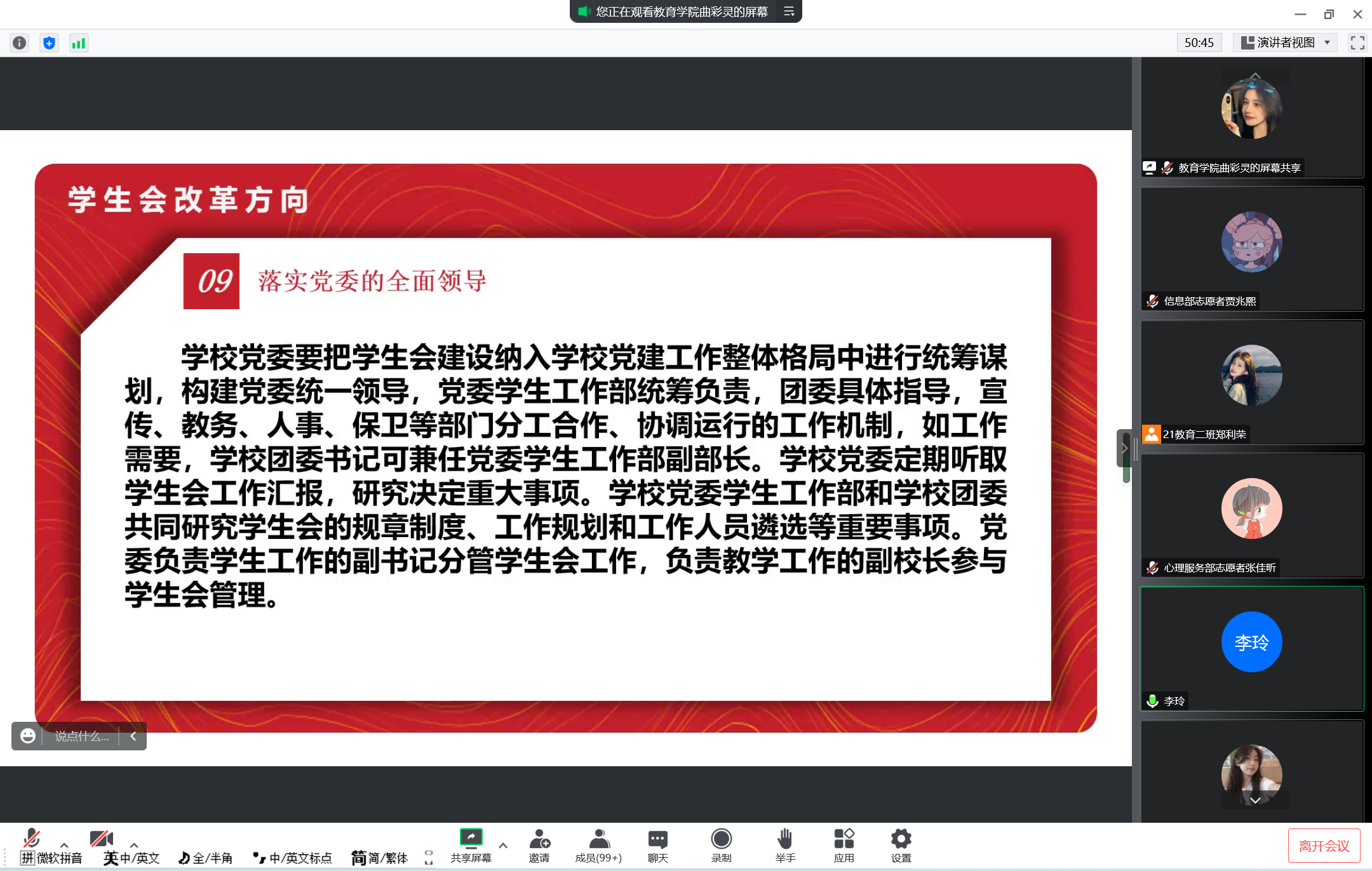 李玲以“学生会改革要求及学生干部价值追求”为题,从学生会改革方向以及学生骨干的自我定位两方面对学生干部进行思想教育。随后,她从明确职能定位、坚持精简原则、坚持从严治会等十个方向对学生会改革提出明确要求,并阐释了学生会改革的原因及其意义。同时,李玲老师也从恪守学生本分、牢记服务宗旨、永葆理想情怀三方面指导学生骨干明确自我定位,并希望p站视频
