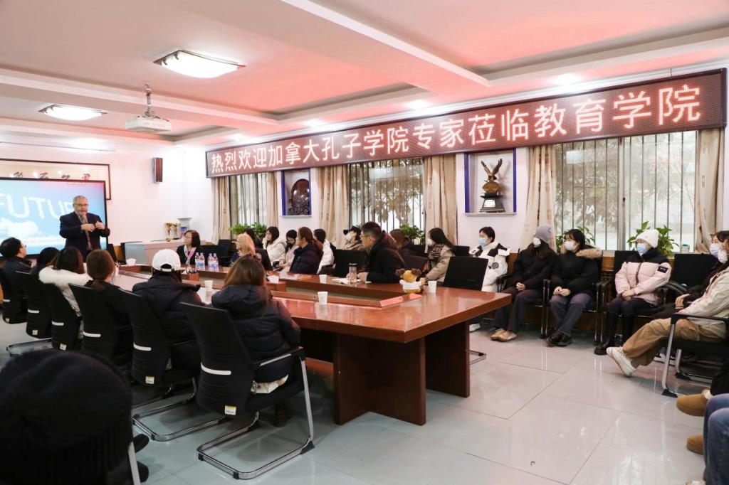 的发展历史、学科建设等基本情况。随后,加拿大孔子学院院长滕菁介绍了加拿大孔子学院的办学特色和学校文化等,并强调“世界需要汉语,世界需要高质量教师”。接着,克里斯·特雷德维尔根据自身的办学实践经验提出一系列实质性的建议,如增强教师组织力、按兴趣授课、联合社区将教育融入生活等,强调教育不应该只停留在课堂,应顺应时代发展并运用到实际生活中去。最后,双方就相关内容展开讨论交流,藤菁对如何实施传统文化课、如何在教育实践中创新等一系列问题作出精彩回答。