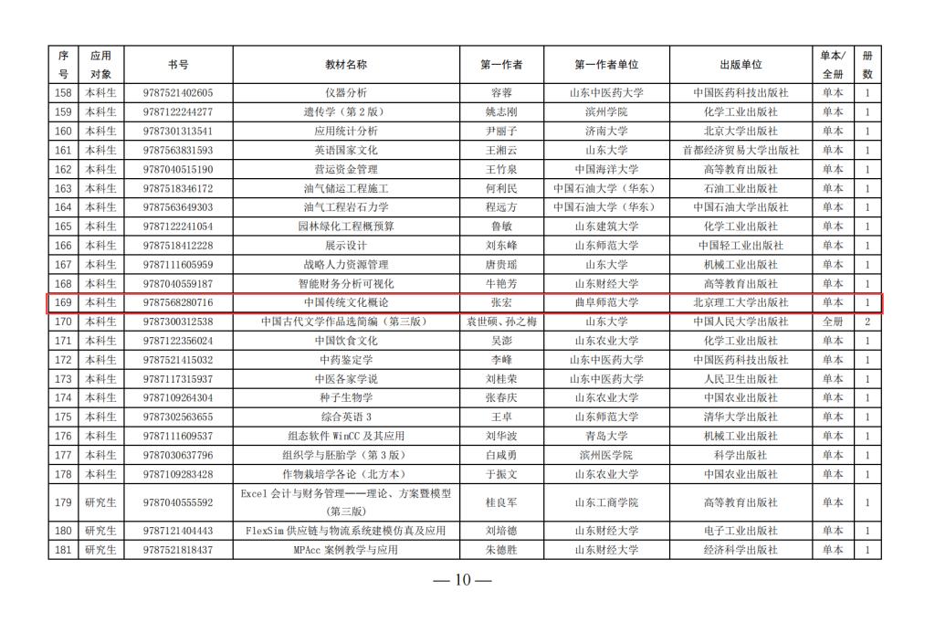 讯(通讯员:孙超)日前,山东省教育厅公布第二批山东省普通高等教育一流教材名单,我院张宏博士主编的《中国传统文化概论》入选,曲阜师大共有4种教材入选。