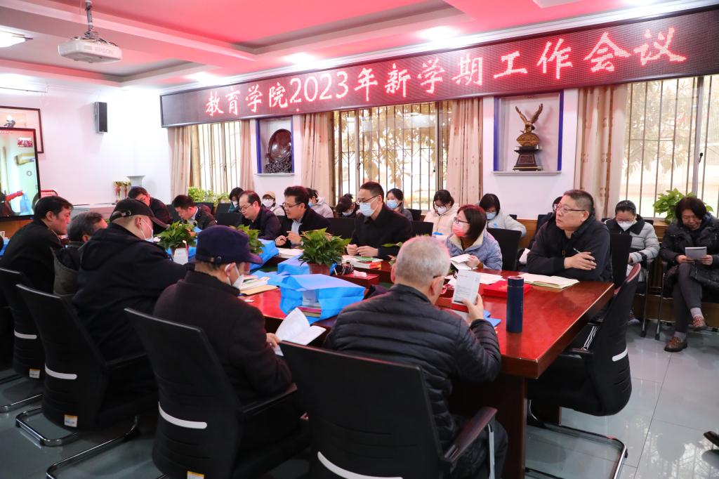 唐爱民在会上结合学校2023年度工作部署会议精神和学院实际,安排部署了修订专业教材、提高人才培养质量、迎接师范专业认证、优化研究生培养模式、优化完善教学科研激励机制、学生考研就业指导服务、学生安全稳定、加强人才引进和师资队伍建设等新学期学院重点工作。他强调,2023年是全面贯彻党的二十大精神的开局之年,也是全面落实学校第九次党代会任务部署的开局之年,2023年学院事业发展的冲锋号已经响起,我们全院师生要提高站位,精诚团结,敢想敢干,争先进位,以一流的精神状态创造一流发展实绩,以奋斗姿态全面推进学院高质量发展新实践。