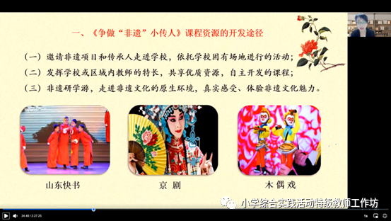 教育系主任李凯博士,分别围绕综合实践活动、劳动课程做了专题报告,山东省小学综合实践特级教师工作坊主持人李允教授主持报告。
