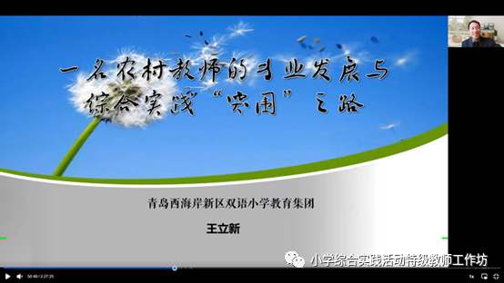 王立新老师以“一名农村教师的专业发展与综合实践‘突围’之路”为题,以“封”“疯”“风”“丰”“峰”“奉”六个字概括分享了自己的专业成长与综合实践活动“突围”之路。其中,“封”是指从事教学工作的第一个十年开始的“封闭”学习研究之路,在这十年间,他相继创建了“生活教育法”、信息技术“5TS商业教学模式”和“综合实践1153教学法”等教学模式;“疯”描述了他在专业成长和研究创新之路中,“爱折腾”和坚持不懈的性格;“风”描绘了他像风一样飘摇参加全国各地的教育培训活动,参加全国各地的巡讲活动;“丰”代表着他在小学综合实践活动创新之路中积累的累累硕果;“峰”指向王老师怀揣的教育理想——即攀登教育的“山峰”,登上教书育人的“义”峰,特级教师的“术”峰,齐鲁名师的“道”峰;“奉”则表达了王老师对教育的奉献精神与爱的情怀。