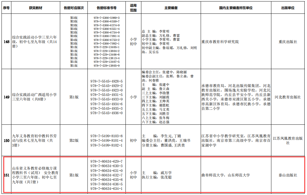 戚万学教授主编的《山东省义务教育必修地方课程教科书(试用)安全教育小学三至六年级、初中七至九年级(共7册)》喜获首届全国优秀教材(基础教育类)二等奖。