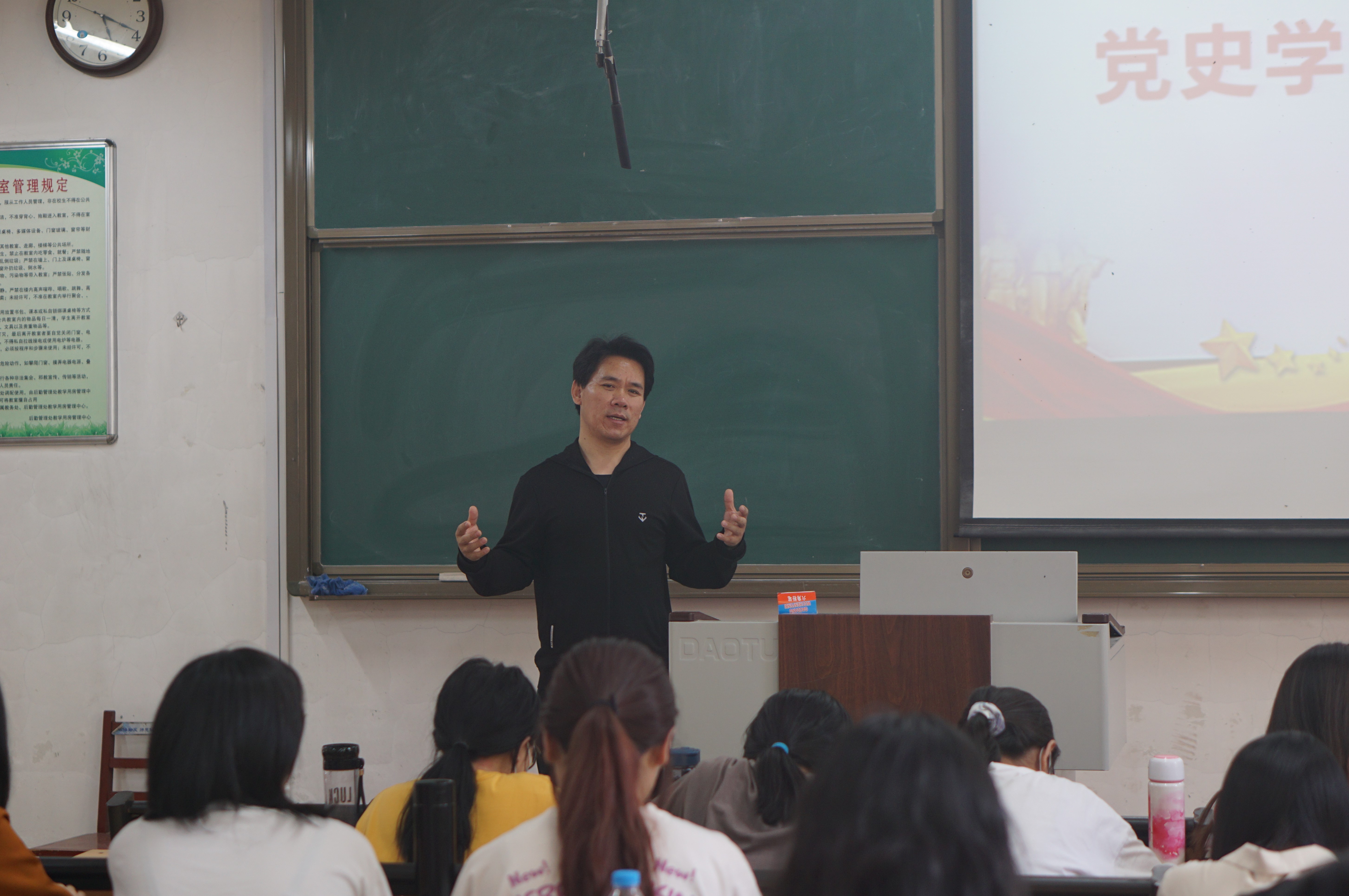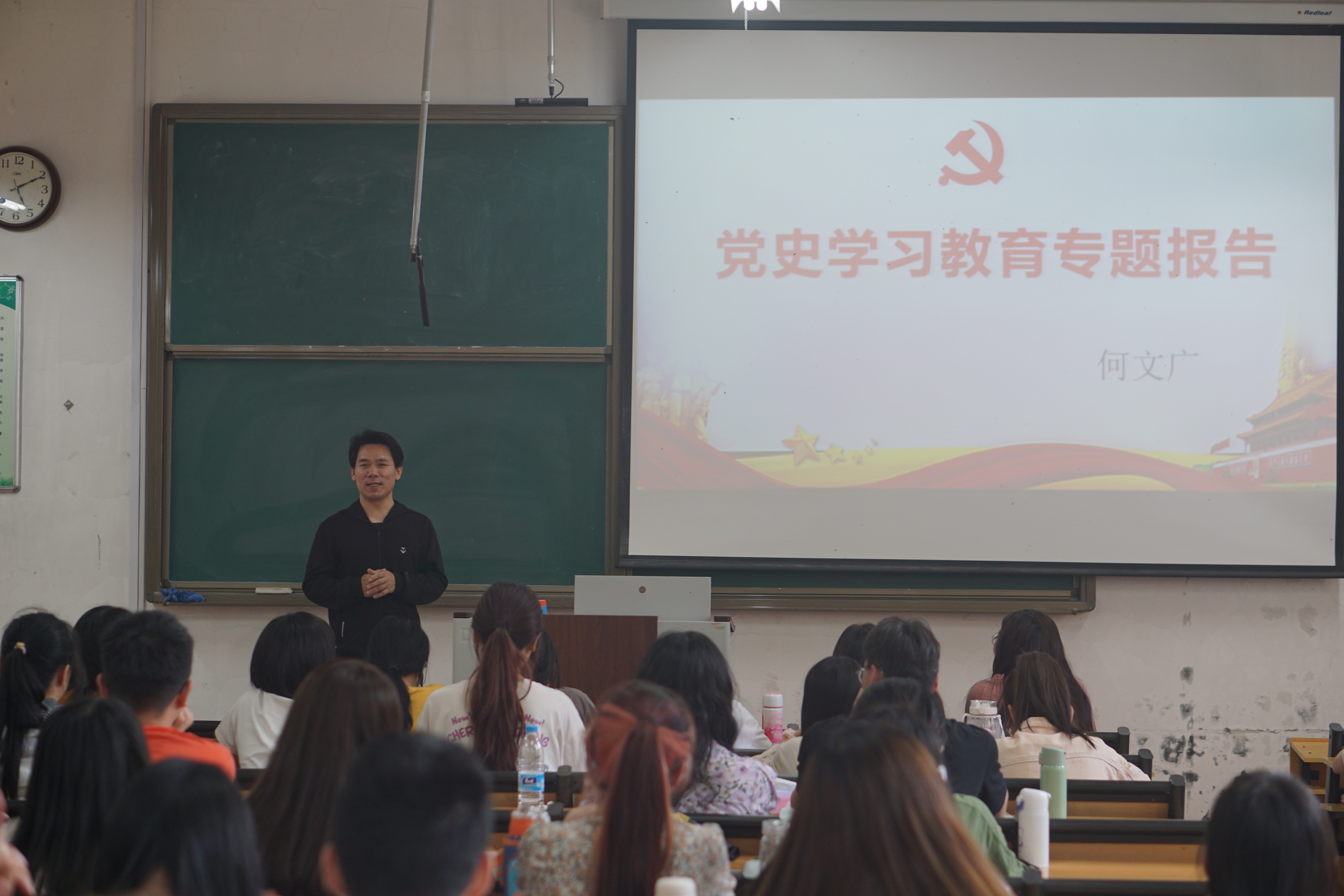 副院长何文广在西联四教室为2019级心理学本科专业学生讲授党史学习教育专题思想政治课,2019级辅导员赵旭涛参加。