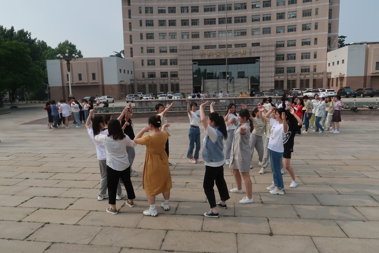 活动开始后,首先由领舞人员进行现场教学,参与人员分成五组,每个小组有一名领舞人员进行舞蹈动作的教学,各小组同时进行舞蹈学习和排练。伴随着轻快又富有节奏的音乐,在领舞人员的带领下,同学们积极认真地练习,整个排练过程洋溢着欢乐的气氛。学习结束后全体同学进行汇报表演,在轻松欢快的音乐旋律中,同学们动作舒展自如,舞蹈动作多样,队伍变化有序,充分展示了大学生的朝气蓬勃,积极向上的良好面貌。