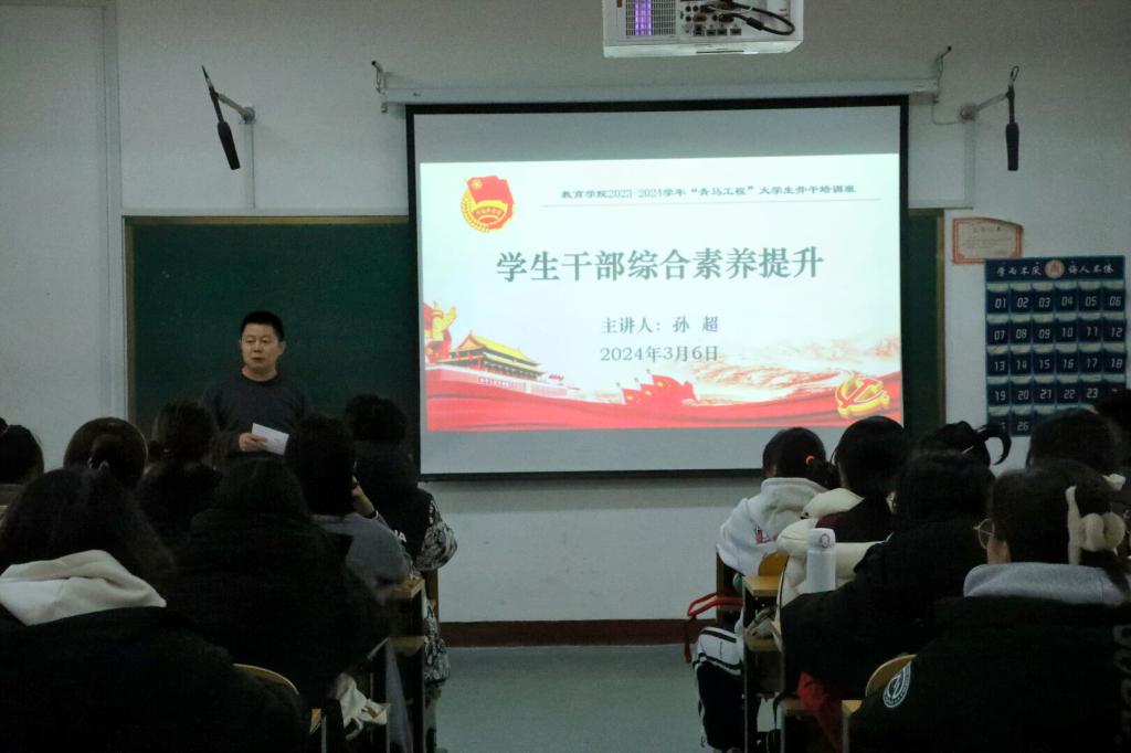 课上,孙超老师从“为何要当一名学生干部”“一名优秀的学生干部应具备哪些素养”“怎样培养过硬的综合素养”三个问题出发,结合教育部、省优秀学生干部评选条件和大量现实案例,就学生干部的综合素养现状及改进措施等问题展开深入剖析,引发学员深思。他指出,学生干部应主动听党话、跟党走,顾大局、识大体,不断锤炼过硬的政治素质和良好的道德素质;他还结合自身经历和工作实际劝勉大家勤学笃行,不断提升文化素质;加强体育锻炼,关注心理健康,学会自我心理调适,重视塑造健全的人格;坚持目标导向和问题导向,不断提高公文写作、语言表达、人际交往、决策管理、组织协调、应急处置等方面能力,的培养保持全面认识自我,不断提升文化素养和语言能力。