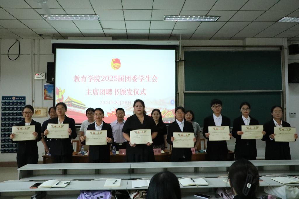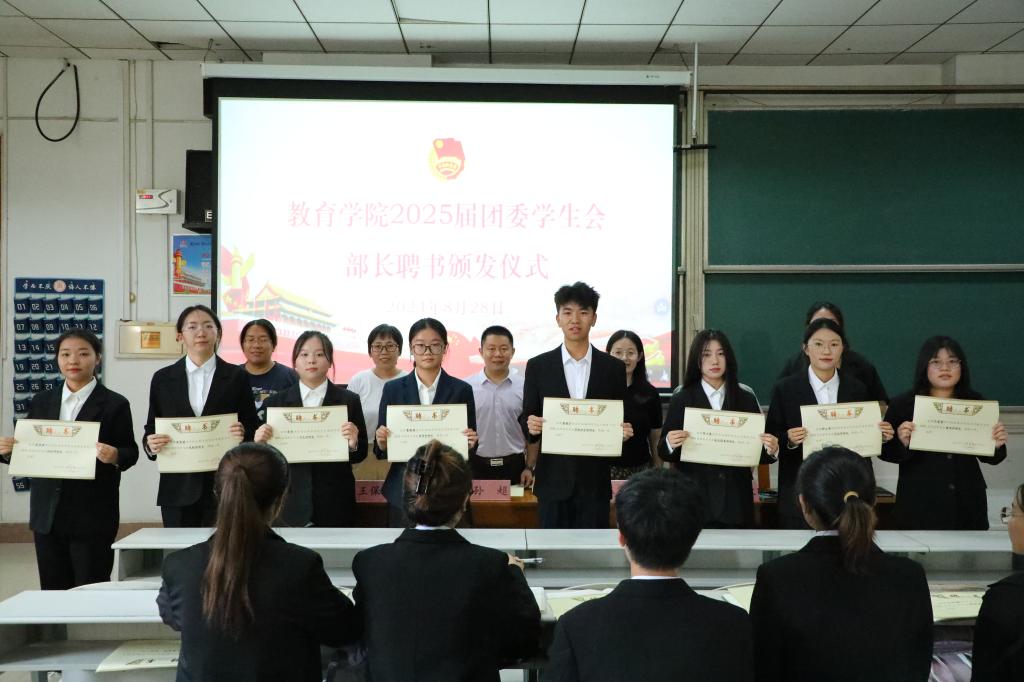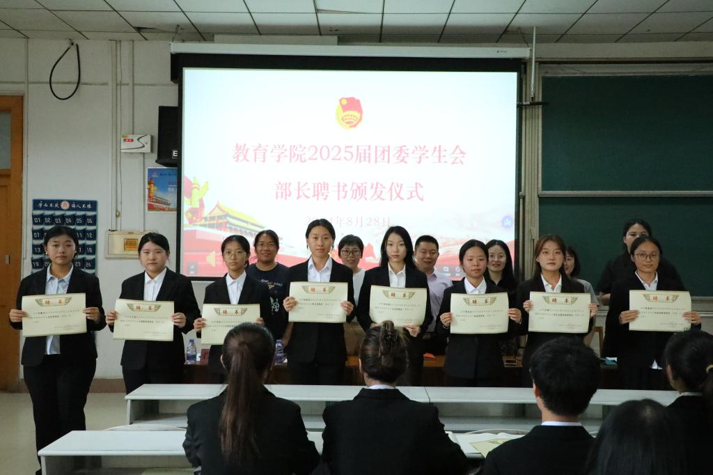 会上,老师们为团委学生会新任主席团成员和部长颁发聘书。