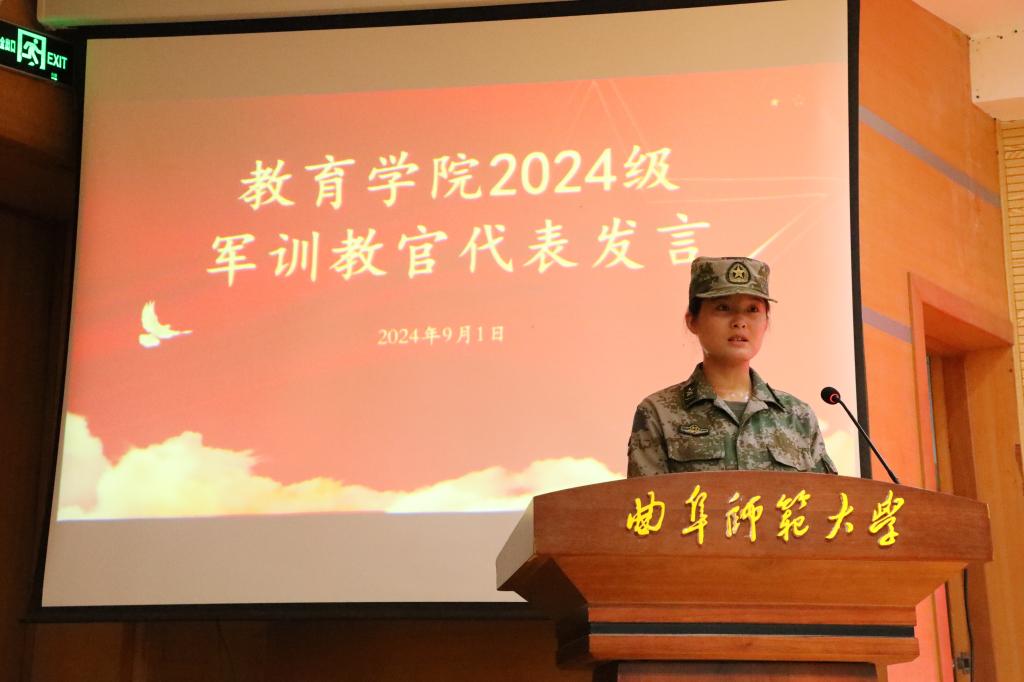 军训教官代表张爽发言。她就军训的重要意义和军训期间的注意事项进行说明,并激励同学们在军训中端正态度、吃苦耐劳。全体教官们期待,通过军训的磨砺,每一位同学都能成为更加坚韧、自信、有担当的新时代好青年。