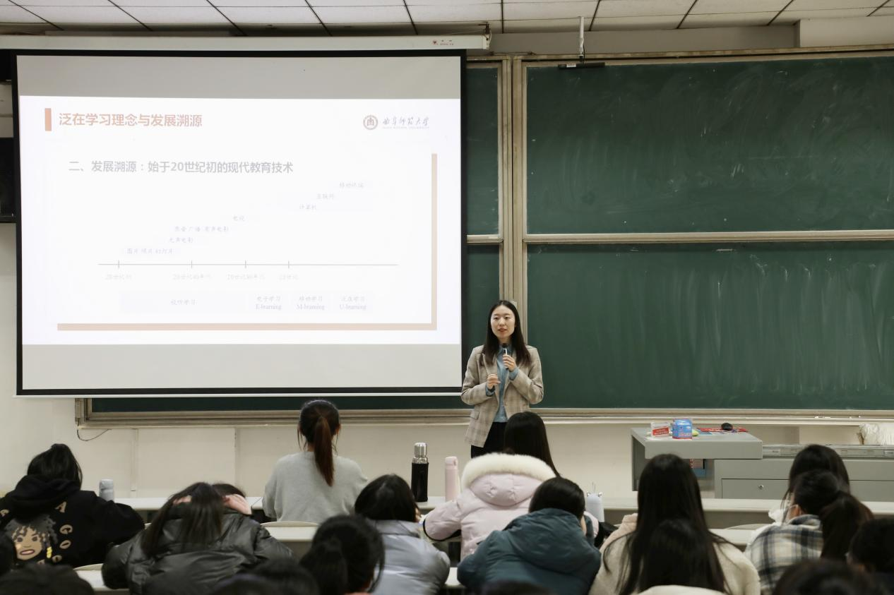副院长齐军老师向同学们介绍了学院的新成员孟志远博士,并鼓励同学们主动学习、把握机会。随后,孟志远博士结合自身的学习经历,详细生动地阐释泛在学习理念与发展溯源、泛在学习时代学习理念及方式转变。孟志远博士指出,泛在学习时代,学者应具备新的素养,明确自己想学什么。同时,她分享了自己日常的学习心得,引起了学生们的共鸣。最后,孟志远博士表达对学生们的殷切期望,希望同学们可以在新时代学习资源不断丰富背景下,顺应变化,拓展学习视野。